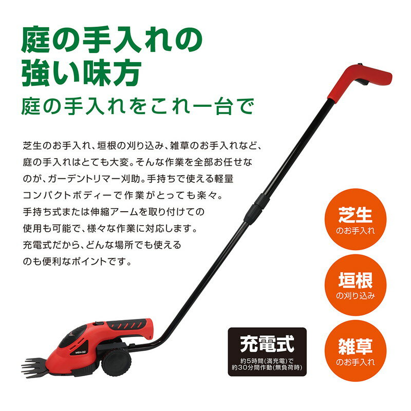 【商品コード】 MEH-92【商品説明】 2種の刃が付属(草刈りカッター/枝切りトリマー)で庭の手入れの強い味方 充電式でどこでも使える【特長】 庭の手入れの強い味方庭の手入れをこれ一台で芝生のお手入れ、垣根の刈り込み、雑草のお手入れなど、庭の手入れはとても大変。